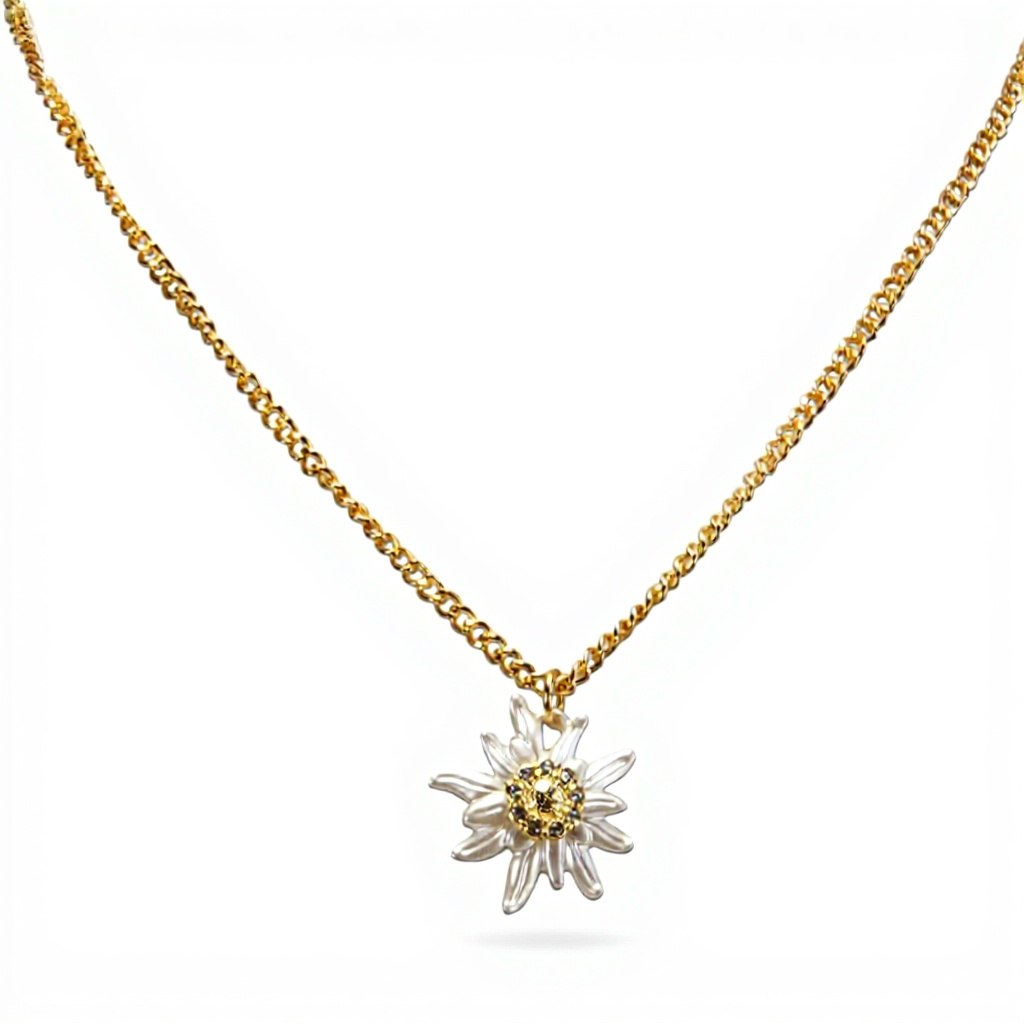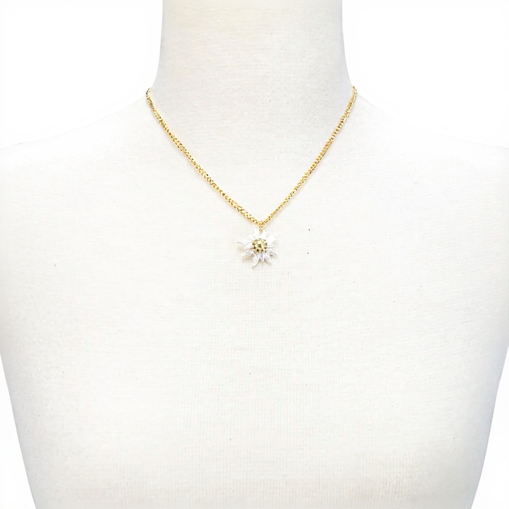 Le collier mesure environ 42 cm de longueur, avec une rallonge de 5 cm pour une ajustabilité optimale. Le pendentif edelweiss présente des dimensions d’environ 2 x 2 cm, réalisé en métal avec des incrustations de strass. Le coloris or vieilli apporte une patine distinctive, renforçant son aspect artisanal et intemporel.