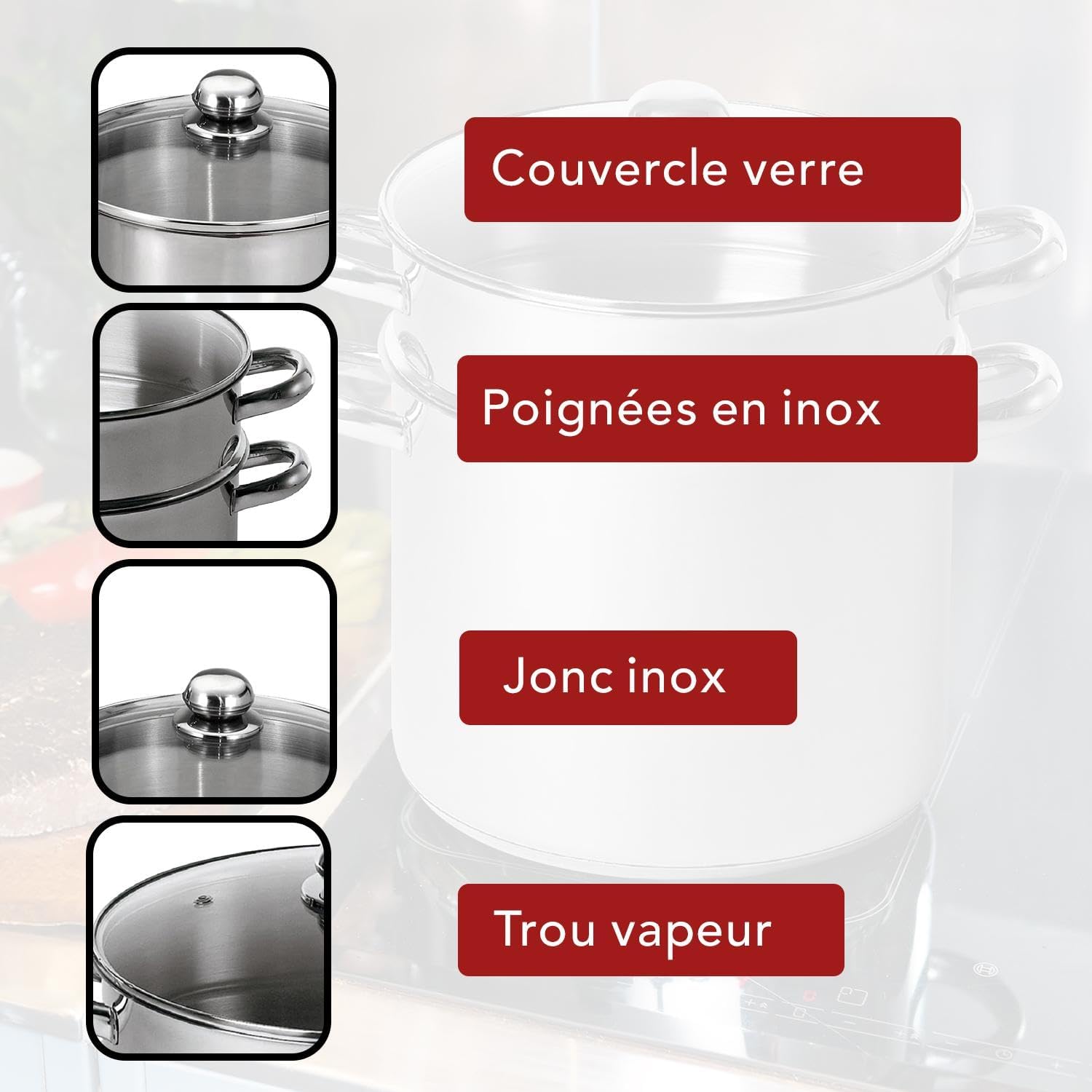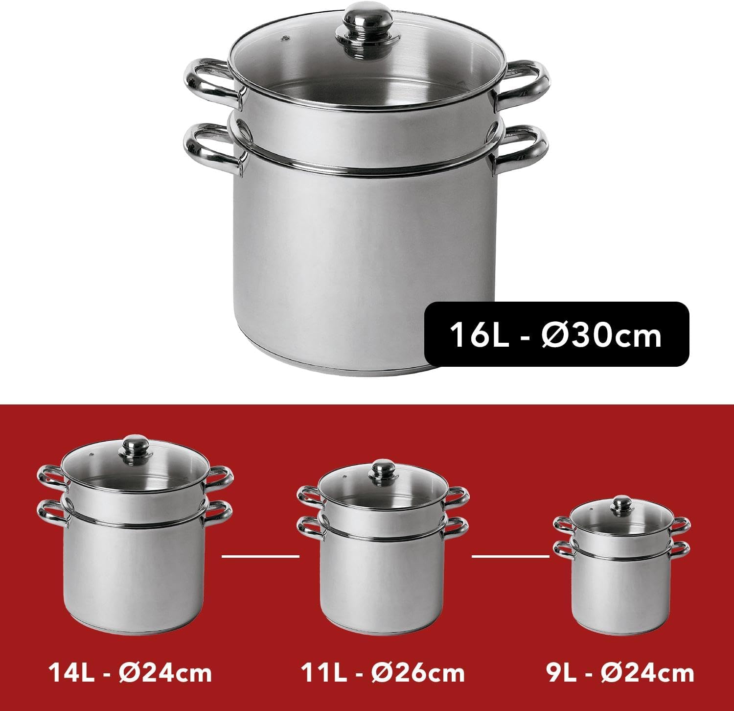 D’un diamètre de 26 cm et d’une capacité de 11 litres, ce couscoussier pèse 2,64 kg. Sa finition polie facilite l’entretien et son design droit optimise l’espace de cuisson. Le modèle certifié sans frustration ne nécessite aucun assemblage et bénéficie d’une disponibilité des pièces détachées sur 2 ans.
