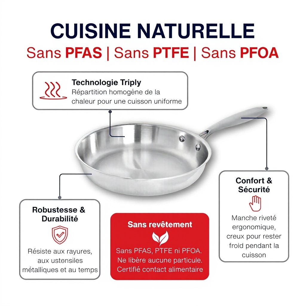 Ces poêles en inox 18/10 bénéficient de la technologie Triply, associant trois couches : inox 18/10 à l’intérieur, aluminium au cœur et inox férritique 18/0 à l’extérieur. Cette construction assure une diffusion homogène de la chaleur, même sur les bords, pour des résultats de cuisson optimaux. Conçues sans revêtement, elles éliminent tout risque de PFAS, PFOA ou PTFE, préservant la santé et l’environnement.