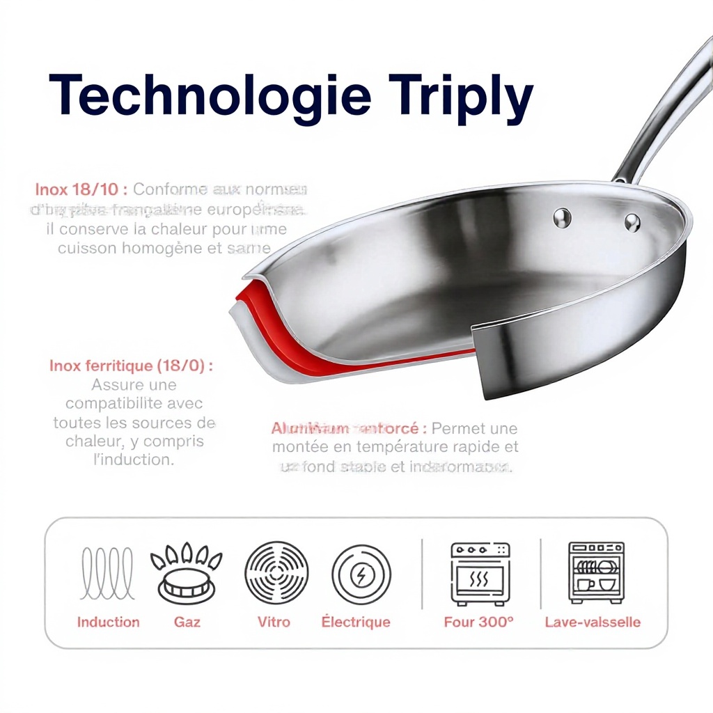 - Technologie Triply pour une répartition uniforme de la chaleur, évitant les points chauds