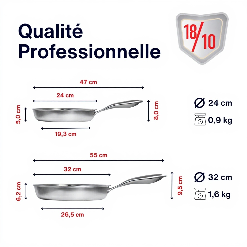 Le lot comprend deux poêles de 24 cm et 32 cm, en acier inoxydable de qualité alimentaire. Le poids total est de 2,6 kg, avec des dimensions de colis de 55 x 34 x 13 cm. Le manche riveté ergonomique reste froid pendant l’utilisation, offrant une prise en main sécurisée. Compatibles avec tous les types de feux (induction, gaz, électrique, vitro) et résistantes jusqu’à 300°C au four.
